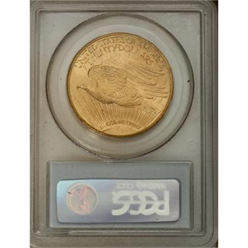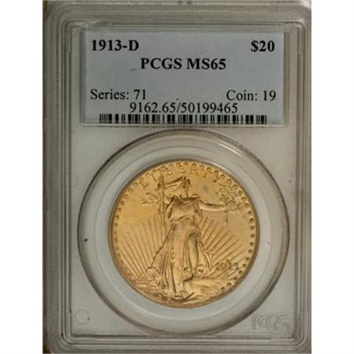 <B>1913-D $20 MS65 PCGS.</B></I> The luster on this Gem is blazing and very nearly cartwheel in its visual effect. The surfaces are fresh and clean, save a single mark on Liberty's forehead and a few isolated contact marks on her body. With a mintage of 393,500, this Denver issue is readily available through MS64. Gems are more difficult and examples finer than Gem are virtually unobtainable. PCGS has graded only four examples finer than MS65 (11/07).<BR><I>From The Jacob Collection of Saint-Gaudens Double Eagles.</B></I><BR><BR><B>Coin Engraver:</B> Augustus Saint-Gaudens<BR><BR><b>Shipping:</b> Coins & Currency (<a target="_blank" href="http://www.heritageauctions.com/common/shipping.php">view shipping information</a>)
