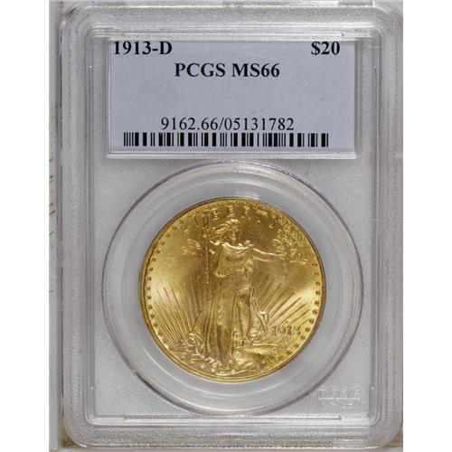 <B>1913-D<$20> MS66 PCGS.</B></I> The 1913 date carries a certain cachet of rarity for all three issues of double eagles from that year. Only one has a memorably low mintage, the 1913-S, with only 34,000 pieces struck. More than ten times that many were produced of the 1913-D, and yet it is perceived to be rarer than other D-mints from the 1910-1916 era. In reality, the 1913-D is a fairly common coin in the lower grades of Uncirculated and even in MS64. However, there is a distinct drop-off in availability at the Gem level, and at the MS66 level the '13-D is virtually unavailable. The combined population of MS66 1913-D twenties shows that nine pieces have been certified--two by PCGS and seven by NGC. We doubt that many actual coins exist in this grade, and submit that several of these nine coins are actually resubmissions. However, none were successful in achieving a higher grade, and MS66 still stands as the finest grade obtainable. The last MS66 sold at public auction was the Morse coin, and that phenomenal piece brought $37,375.<BR> Akers notes that two distinct finishes are seen on the 1913-D. One is softly frosted with some granularity. The other is satiny. He also notes that this latter finish is, for some unknown reason, seen most frequently on high grade examples. This particular piece has that satin-like finish. The surfaces are exceptionally clean, especially on the obverse. The coin has a slight reddish tinge with subtle accents of lilac interspersed. Fully struck. This is a rare opportunity for the advanced collector of Saint-Gaudens twenties.