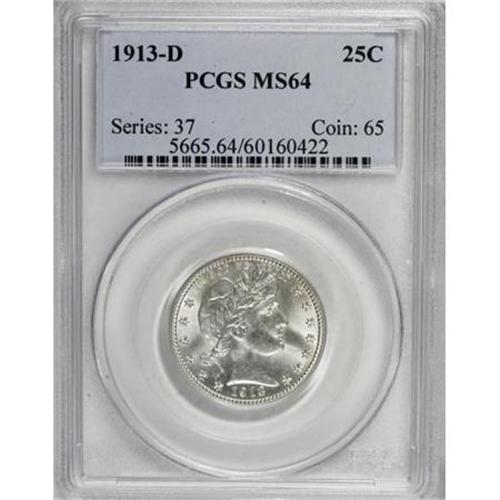<B>1913-D 25C MS64 PCGS.</B></I> PCGS Population (34/35). NGC Census: (34/24). Mintage: 1,450,800. Numismedia Wsl. Price for NGC/PCGS coin in MS64: $480. (#5665)<BR><BR><B>Coin Engraver:</B> Charles E. Barber<BR><BR><b>Shipping:</b> Coins & Currency (<a target="_blank" href="http://www.heritageauctions.com/common/shipping.php">view shipping information</a>)