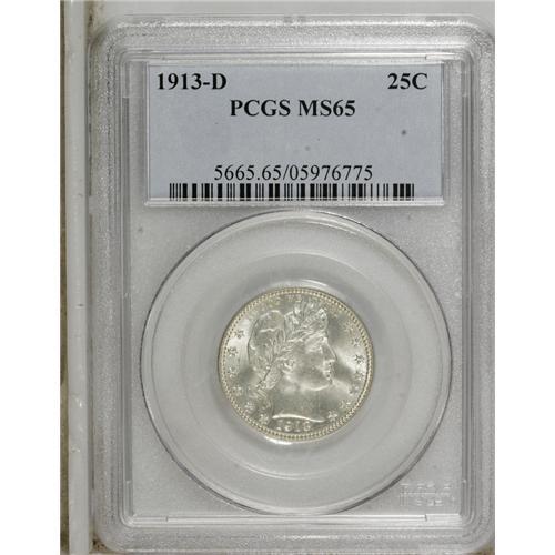 <B>1913-D 25C MS65 PCGS.</B></I> A highly lustrous and largely untoned Gem. The obverse has suitable definition, though the eagle's right (facing) talon is soft. Population: 24 in 65, 10 finer (1/07).<BR><BR><b>Shipping:</b> Coins & Currency (<a target="_blank" href="http://www.heritageauctions.com/common/shipping.php">view shipping information</a>)