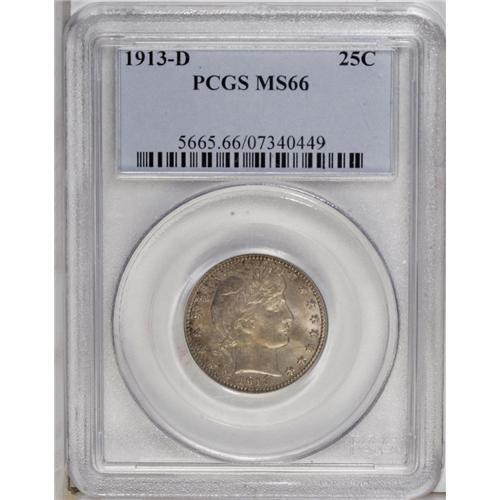 <B>1913-D 25C MS66 PCGS.</B></I> Golden-brown, olive, and dove-gray toning drapes this satiny low mintage quarter. Marks are negligible, and the strike is reasonable, with softness only on the fletchings and star 11. The 1913-D stands in the shadow of the famous 1913-S, but believe it or not, fewer 1913-D quarters have been certified as MS66 and finer. Population: 10 in 66, 0 finer (10/06).<BR><BR><b>Shipping:</b> Coin/Currency (<a target="_blank" href="http://www.heritageauctions.com/common/shipping.php">view shipping information</a>)