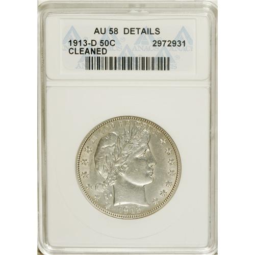 <B>1913-D 50C --Cleaned--ANACS. AU58 Details.</B></I> NGC Census: (64/218). PCGS Population (27/129). Mintage: 534,000. Numismedia Wsl. Price for NGC/PCGS coin in AU58: $300. (#6528)<BR><BR><b>Shipping:</b> Coins & Currency (<a target="_blank" href="http://www.heritageauctions.com/common/shipping.php">view shipping information</a>)