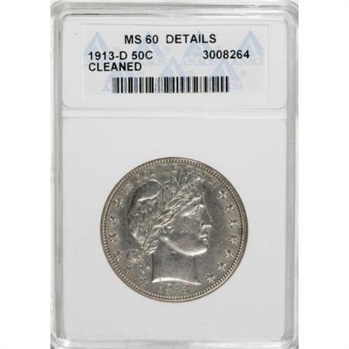 <B>1913-D 50C --Cleaned--ANACS. MS60 Details.</B></I> NGC Census: (0/109). PCGS Population (2/126). Mintage: 534,000. Numismedia Wsl. Price for NGC/PCGS coin in MS60: $442. (#6528)<BR><BR><B>Coin Engraver:</B> Charles E. Barber<BR><BR><b>Shipping:</b> Coins & Currency (<a target="_blank" href="http://www.heritageauctions.com/common/shipping.php">view shipping information</a>)