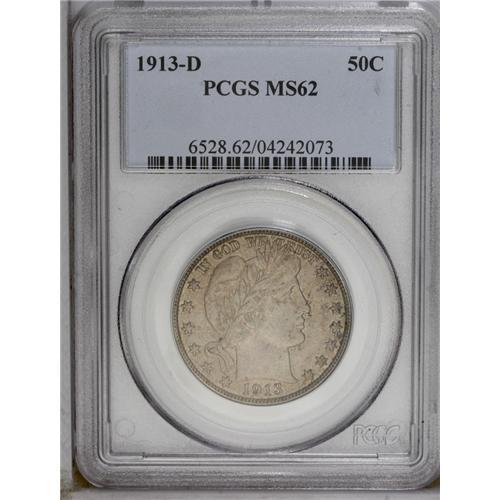 <B>1913-D<50C> MS62 PCGS.</B></I> The Denver Mint's emission for this year amounted to a scant 534,000 business strikes. This example is well preserved with gray-gold color, even on the obverse and with a dappled effect on the reverse. Close inspection reveals no annoying abrasions. <BR><BR><B>Important notice:</B> Heritage usually auctions material at the rate of 200-250 lots per hour. On some occasions eBay Live bid software or the Internet may not be able to keep up with the pace of the auction. We recommend placing a realistic absentee bid now as insurance to avoid disappointment. Occasionally the auctioneer may eliminate or reject an eBay Live bid, and the auctioneer may also reopen a lot after the close of the eBay live bidding (usually because we missed an audience bid), and may reject your bid even if it shows you as the winning bidder. By bidding via eBay Live, you agree that Heritage may award the lot to another bidder at its sole discretion under the circumstances described above or any other reasonable circumstances. Since eBay bids are not shown to us until we open the lot on the floor, we treat those bids just like floor bids. In most cases the floor responds before the eBay bid is presented to us, due to Internet lag time, so for consistency we have made it a policy that floor bids are always considered first over tie eBay live bids. Also please note that all Heritage lots purchased through eBay Live carry a 20% Buyer's Premium. Please make sure you read the Terms and Conditions before you bid. This lot is being auctioned in conjunction with a live floor auction by Heritage Galleries & Auctioneers. All final auction and invoice information will be supplied by Heritage Galleries & Auctioneers, and all other information should be considered preliminary. Lot:2078 <BR><BR><B>Winning Notification and Billing:</B> After the FINAL session in this auction is complete, Heritage will send e-mail and snail mail invoices. This process normally takes several days. All final auction and invoice information will be supplied by Heritage Galleries & Auctioneers, and all other information should be considered preliminary. <BR><BR>This auction will be conducted on a live auction floor and over the Internet through eBay Live. If you choose to place an absentee bid, please take a moment to <font color='#0000ff'><u><a href='http://pages.ebay.com/liveauctions/help/before/laabsentee.html'>learn how eBay Live absentee bidding works</a></u></font><font color='#000000'>