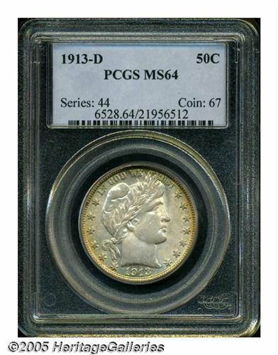 <B>1913-D<50C> MS64 PCGS.</B></I> The reverse exhibits beautiful gold and rose hues, and the obverse is nearly as lovely, since the cream-gray centers are encompassed by peach and lime tints. The luster is impressive, and the strike is suitable although not bold. A faint mark near the chin does not especially distract. The 1913-D has the lowest mintage of any Denver Mint Barber Half.
