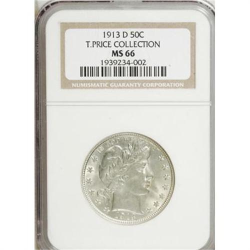 <B>1913-D 50C MS66 NGC.</B></I> Ex: T. Price Collection. This Condition Census half dollar is refreshingly smooth, and the shimmering surfaces are brilliant, save for delicate ice-blue and gold patina. The strike is nearly full, with only a whisper of incompleteness on the highpoints. Outstanding quality for this low-mintage issue, and an impressive pedigree as well. Census: 5 in 66, 0 finer (1/08).<BR><I>Ex: Dr. Thaine B. Price Collection (David Akers, 5/98), lot 190.<BR>From The Southwest Collection.</B></I><BR><BR><B>Coin Engraver:</B> Charles E. Barber<BR><BR><b>Shipping:</b> Coins & Currency (<a target="_blank" href="http://www.heritageauctions.com/common/shipping.php">view shipping information</a>)