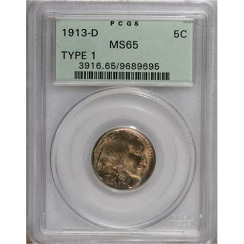 <B>1913-D 5C Type One MS65 PCGS.</B></I> PCGS Population (565/293). NGC Census: (426/156). Mintage: 5,337,000. Numismedia Wsl. Price for NGC/PCGS coin in MS65: $246. (#3916)<BR><BR><B>Coin Engraver:</B> James E. Fraser<BR><BR><b>Shipping:</b> Coins & Currency (<a target="_blank" href="http://www.heritageauctions.com/common/shipping.php">view shipping information</a>\)