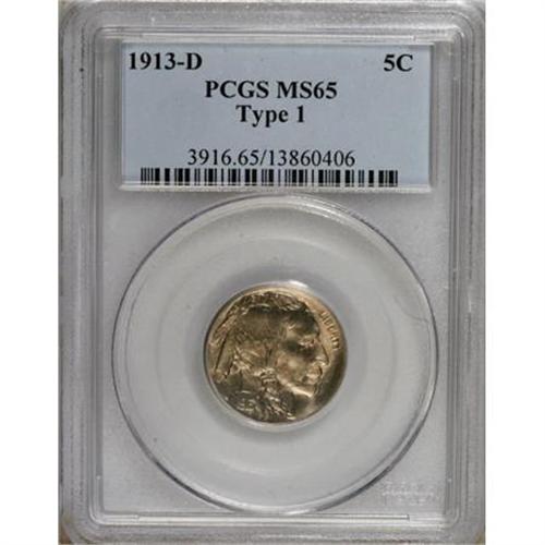 <B>1913-D 5C Type One MS65 PCGS.</B></I> PCGS Population (565/293). NGC Census: (426/156). Mintage: 5,337,000. Numismedia Wsl. Price for NGC/PCGS coin in MS65: $246. (#3916)<BR><BR><B>Coin Engraver:</B> James E. Fraser<BR><BR><b>Shipping:</b> Coins & Currency (<a target="_blank" href="http://www.heritageauctions.com/common/shipping.php">view shipping information</a>\)