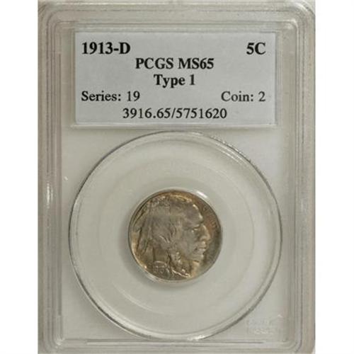 <B>1913-D 5C Type One MS65 PCGS.</B></I> PCGS Population (570/296). NGC Census: (426/156). Mintage: 5,337,000. Numismedia Wsl. Price for NGC/PCGS coin in MS65: $246. (#3916)<BR><BR><B>Coin Engraver:</B> James E. Fraser<BR><BR><b>Shipping:</b> Coins & Currency (<a target="_blank" href="http://www.heritageauctions.com/common/shipping.php">view shipping information</a>)