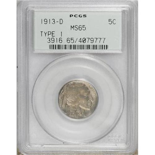 <B>1913-D 5C Type One MS65 PCGS.</B></I> PCGS Population (607/307). NGC Census: (447/167). Mintage: 5,337,000. Numismedia Wsl. Price for NGC/PCGS coin in MS65: $246. (#3916)<BR><BR><B>Coin Engraver:</B> James E. Fraser<BR><BR><b>Shipping:</b> Coins & Currency (<a target="_blank" href="http://www.heritageauctions.com/common/shipping.php">view shipping information</a>)