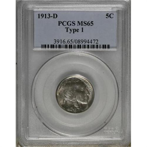 <B>1913-D 5C Type One MS65 PCGS.</B></I> PCGS Population (649/320). NGC Census: (455/171). Mintage: 5,337,000. Numismedia Wsl. Price for NGC/PCGS coin in MS65: $246. (#3916)<BR><BR><B>Coin Engraver:</B> James E. Fraser<BR><BR><b>Shipping:</b> Coins & Currency (<a target="_blank" href="http://www.heritageauctions.com/common/shipping.php">view shipping information</a>)