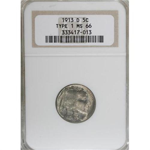 <B>1913-D 5C Type One MS66 NGC.</B></I> NGC Census: (156/11). PCGS Population (266/40). Mintage: 5,337,000. Numismedia Wsl. Price for NGC/PCGS coin in MS66: $510. (#3916)<BR><BR><B>Coin Engraver:</B> James E. Fraser<BR><BR><b>Shipping:</b> Coins & Currency (<a target="_blank" href="http://www.heritageauctions.com/common/shipping.php">view shipping information</a>)