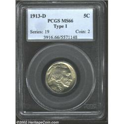 1913-D 5C Type One MS66 PCGS. Rich dove-gray color dominates, with faint streaks of golden-brown patina on the reverse. A needle-sharp Gem that has essentially pristine surfaces. A wonderful coin that will please even the most demanding specialist.From the BTB Collection of Buffalo Nickels. Important notice: We expect to be auctioning lots at the rate of 200-250 per hour. Sometimes eBay Premier live bid software cannot keep up with that pace, so we strongly recommend that you place a realistic proxy bid now as insurance to avoid disappointment. Also please note that all Heritage/CAA lots purchased through eBay Premier carry a 20% Buyer's Premium. Please make sure you read the Terms and Conditions.
