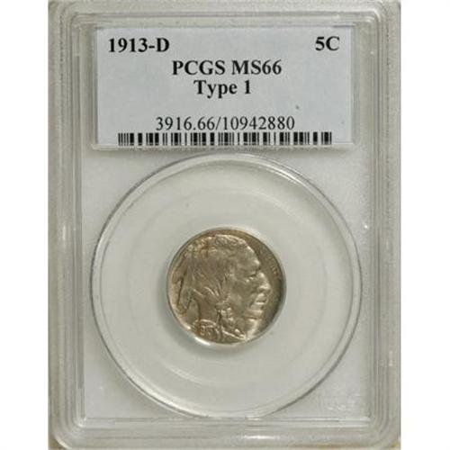 <B>1913-D 5C Type One MS66 PCGS.</B></I> PCGS Population (281/41). NGC Census: (160/11). Mintage: 5,337,000. Numismedia Wsl. Price for NGC/PCGS coin in MS66: $515. (#3916)<BR><BR><B>Coin Engraver:</B> James E. Fraser<BR><BR><b>Shipping:</b> Coins & Currency (<a target="_blank" href="http://www.heritageauctions.com/common/shipping.php">view shipping information</a>)