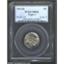 <TR><TD width="100%"><TABLE cellSpacing=1 cellPadding=3 width="100%" border=0><TBODY><TR><TD width="100%" bgColor=#79735c><FONT face=arial color=#ffffff size=3><B>Description</B> </FONT></TD></TR><TR><TD width="100%" bgColor=#ffffff><FONT face=arial size=2><B>1913-D 5C Type One MS66 PCGS.</B></I> Powder-blue and tan-gold colors. A well struck premium Gem with shimmering luster and beautifully preserved surfaces. The dies are worn and have minor spreading of the peripheral legends, but from a technical perspective this is a magnificent first-year example. </FONT></TD></TR></TBODY></TABLE></TD></TR></TBODY></TABLE><BR><A name=PricesRealized></A><TABLE cellSpacing=0 cellPadding=0 width="100%" bgColor=#000000 border=0><TBODY><TR><TD width="100%"><TABLE cellSpacing=1 cellPadding=3 width="100%" border=0><TBODY><TR><TD width="100%" bgColor=#79735c><A name=PR><FONT face=arial color=#ffffff size=3><B>Previous Prices from Heritage Auctions</B> </FONT></A></TD></TR><TR><TD bgColor=#f6f6ed><TABLE cellSpacing=0 cellPadding=0 width="100%" border=1><TBODY><TR><TD align=middle width="33%"><B>Date</B></TD><TD align=middle width="33%"><B>Service</B></TD><TD align=middle width="33%"><B>Price</B></TD></TR><TR bgColor=whitesmoke><TD width="33%"><B>05/05/2003</B></TD><TD width="33%">PCGS</TD><TD width="33%">$1,495.00</TD></TR><TR bgColor=whitesmoke><TD width="33%"><B>06/04/2002</B></TD><TD width="33%">PCGS</TD><TD width="33%">$483.00</TD></TR><TR bgColor=whitesmoke><TD width="33%"><B>06/08/2002</B></TD><TD width="33%">PCGS</TD><TD width="33%">$437.00</TD></TR><TR bgColor=whitesmoke><TD width="33%"><B>06/08/2002</B></TD><TD width="33%">PCGS</TD><TD width="33%">$661.25</TD></TR><TR bgColor=whitesmoke><TD width="33%"><B>01/16/2001</B></TD><TD width="33%">PCGS</TD><TD width="33%">$380.00</TD></TR><TR bgColor=whitesmoke><TD width="33%"><B>01/09/1999</B></TD><TD width="33%">PCGS</TD><TD width="33%">$357.50</TD></TR><TR bgColor=whitesmoke><TD width="33%"><B>08/13/1996</B></TD><TD width="33%">PCGS</TD><TD width="33%">$319.00</TD></TR><TR bgColor=whitesmoke><TD width="33%"><B>01/05/1994</B></TD><TD width="33%">PCGS</TD><TD width="33%">$335.50</TD></TR><TR bgColor=whitesmoke><TD width="33%"><B>07/31/1993</B></TD><TD width="33%">PCGS</TD><TD width="33%">$412.50</TD></TR><TR bgColor=whitesmoke><TD width="33%"><B>04/30/1993</B></TD><TD width="33%">PCGS</TD><TD width="33%">$385.00</TD></TR><TR bgColor=whitesmoke><TD width="33%"><B>05/31/2001</B></TD><TD width="33%">PCGS</TD><TD width="33%">$488.75</TD></TR><TR bgColor=whitesmoke><TD width="33%"><B>04/05/2001</B></TD><TD width="33%">PCGS</TD><TD width="33%">$632.50</TD></TR><TR bgColor=whitesmoke><TD width="33%"><B>08/08/2001</B></TD><TD width="33%">PCGS</TD><TD width="33%">$488.75</TD></TR><TR bgColor=whitesmoke><TD width="33%"><B>02/22/1997</B></TD><TD width="33%">PCGS</TD><TD width="33%">$302.50</TD></TR><TR bgColor=whitesmoke><TD width="33%"><B>07/01/1996</B></TD><TD width="33%">PCGS</TD><TD width="33%">$715.00</TD></TR><TR bgColor=whitesmoke><TD width="33%"><B>10/01/1998</B></TD><TD width="33%">PCGS</TD><TD width="33%">$687.00</TD></TR><TR bgColor=whitesmoke><TD width="33%"><B>02/12/2000</B></TD><TD width="33%">PCGS</TD><TD width="33%">$603.75</TD></TR><TR bgColor=whitesmoke><TD width="33%"><B>02/24/1995</B></TD><TD width="33%">PCGS</TD><TD width="33%">$445.50</TD></TR><TR bgColor=whitesmoke><TD width="33%"><B>07/30/1994</B></TD><TD width="33%">PCGS</TD><TD width="33%">$1,815.00</TD></TR><TR bgColor=whitesmoke><TD width="33%"><B>05/03/2003</B></TD><TD width="33%">PCGS</TD><TD width="33%">$529.00</TD></TR><TR bgColor=whitesmoke><TD width="33%"><B>05/03/2003</B></TD><TD width="33%">PCGS</TD><TD width="33%">$632.50</TD></TR><TR bgColor=whitesmoke><TD width="33%"><B>03/01/2003</B></TD><TD width="33%">PCGS</TD><TD width="33%">$546.25</TD></TR><TR bgColor=whitesmoke><TD width="33%"><B>03/01/2003</B></TD><TD width="33%">PCGS</TD><TD width="33%">$546.25</TD></TR><TR bgColor=whitesmoke><TD width="33%"><B>03/23/2003</B></TD><TD width="33%">PCGS</TD><TD width="33%">$862.50</TD></TR><TR bgColor=whitesmoke><TD width="33%"><B>02/23/2001</B></TD><TD width="33%">NGC</TD><TD width="33%">$322.00</TD></TR><TR bgColor=whitesmoke><TD width="33%"><B>12/24/2002</B></TD><TD width="33%">PCGS</TD><TD width="33%">$494.50</TD></TR><TR bgColor=whitesmoke><TD width="33%"><B>08/13/2002</B></TD><TD width="33%">PCGS</TD><TD width="33%">$517.50</TD></TR><TR bgColor=whitesmoke><TD width="33%"><B>08/14/1995</B></TD><TD width="33%">NGC</TD><TD width="33%">$247.50</TD></TR></TBODY></TABLE></TD></TR><TR><TD bgColor=#ffffff><FONT face=arial size=1 ?>PLEASE NOTE: All prices realized reflect the final hammer price PLUS the buyer's premium in auctions that charge a buyer's premium. Each item has a notation at the top of the listing indicating whether that lot included a buyer's premium. Example: A item that sells with a final hammer price of $100 and a 20% buyer's premium will display with a price realized of $120. All information listed is intended to be as accurate as possible, but errors are possible. Please use this guide carefully and inform us of any inaccuracies. </FONT></TD></TR></TBODY></TABLE></TD></TR></TBODY></TABLE><BR><TABLE cellSpacing=0 cellPadding=0 width="100%" bgColor=#000000 border=0><TBODY><TR><TD width="100%"><TABLE cellSpacing=1 cellPadding=3 width="100%" border=0><TBODY><TR><TD width="100%" bgColor=#79735c colSpan=6><FONT face=arial color=#ffffff size=3><B>Price Guide*</B> </FONT></TD></TR><TR bgColor=#f6f6ed><TD align=middle><B>Grade</B> </TD><TD align=middle><B>Coin World<BR>(Trends)</B> </TD><TD align=middle><B>Numismedia<BR>Retail</B> </TD><TD align=middle><B>Numismedia<BR>Wholesale</B> </TD><TD align=middle><B>Coin<BR>Universe</B> </TD><TD align=middle><B>Heritage<BR>Value Index</B> </TD></TR><TR bgColor=#ffffff><TD align=middle>65</TD><TD align=right>$315.00</TD><TD align=right>$290.00</TD><TD align=right>$232.00</TD><TD align=right>$360.00</TD><TD align=right>$234.88</TD></TR><TR 