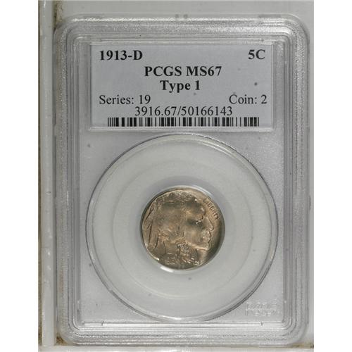 <B>1913-D 5C Type One MS67 PCGS.</B></I> The 1913-D Type One is generally a well produced issue that has strong mint luster. In addition, it also has the charm of being part of a three-issue set of a one-year type. This is a lovely example that has even reddish tinted color and strong underlying mint frost. Sharply struck throughout, there are no mentionable marks on either side. Population: 38 in 67, 2 finer (3/07).<BR><BR><b>Shipping:</b> Coins & Currency (<a target="_blank" href="http://www.heritageauctions.com/common/shipping.php">view shipping information</a>)