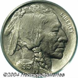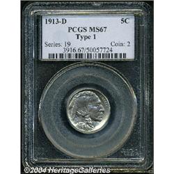 <B>1913-D<5C> Type One MS67 PCGS.</B></I> As with many first-year issues, the 1913-D was produced in rather large numbers; in this case 5.3 million pieces were struck. While not rare in the absolute sense, it is, nevertheless a worthwhile issue in high grades (especially when compared to the 1913-P) and a moderate condition rarity. The obverse shows pinpoint striking details, and the only area of even modest softness is the matted hair on the bison's head. Fully brilliant with bright, matte-like surfaces and no mentionable marks or spots. Population: 30 in 67, 1 finer (9/04). <BR><BR><B>Important notice:</B> Heritage usually auctions material at the rate of 200-250 lots per hour. On some occasions eBay Live bid software or the Internet may not be able to keep up with the pace of the auction. We recommend placing a realistic absentee bid now as insurance to avoid disappointment. Occasionally the auctioneer may eliminate or reject an eBay Live bid, and the auctioneer may also reopen a lot after the close of the eBay live bidding (usually because we missed an audience bid), and may reject your bid even if it shows you as the winning bidder. By bidding via eBay Live, you agree that Heritage may award the lot to another bidder at its sole discretion under the circumstances described above or any other reasonable circumstances. Since eBay bids are not shown to us until we open the lot on the floor, we treat those bids just like floor bids. In most cases the floor responds before the eBay bid is presented to us, due to Internet lag time, so for consistency we have made it a policy that floor bids are always considered first over tie eBay live bids. Also please note that all Heritage lots purchased through eBay Live carry a 20% Buyer's Premium. Please make sure you read the Terms and Conditions before you bid.