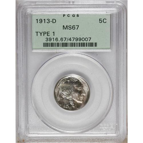 <B>1913-D<5C> Type One MS67 PCGS.</B></I> Sharp striking details are noted on each side (except on the bison's head and shoulder) along with immaculately preserved surfaces. An orange-peel texture is prominent in the fields. Lovely rose, purple-brown, and steel-blue toning adorns this first-year Superb Gem. Population: 37 in 67, 1 finer (7/06). <BR><BR><B>Important notice:<