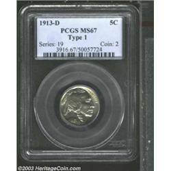 <TABLE cellSpacing=0 cellPadding=0 width="100%" bgColor=#000000 border=0><TBODY><TR><TD width="100%"><TABLE cellSpacing=1 cellPadding=3 width="100%" border=0><TBODY><TR><TD width="100%" bgColor=#79735c><FONT face=arial color=#ffffff size=3><B>Description</B> </FONT></TD></TR><TR><TD width="100%" bgColor=#ffffff><FONT face=arial size=2><B>1913-D 5C Type One MS67 PCGS.</B></I> As with many first-year issues, the 1913-D was produced in rather large numbers; in this case 5.3 million pieces were struck. While not rare in the absolute sense, it is, nevertheless a worthwhile issue in high grades (especially when compared to the 1913-P) and a moderate condition rarity. The obverse shows pinpoint striking details, and the only area of even modest softness is the matted hair on the bison's head. Mostly brilliant with just the slightest accent of pastel iridescence present when closely examined. Population: 20 in 67, 0 finer (8/03). </FONT></TD></TR></TBODY></TABLE></TD></TR></TBODY></TABLE><BR><A name=PricesRealized></A><TABLE cellSpacing=0 cellPadding=0 width="100%" bgColor=#000000 border=0><TBODY><TR><TD width="100%"><TABLE cellSpacing=1 cellPadding=3 width="100%" border=0><TBODY><TR><TD width="100%" bgColor=#79735c><A name=PR><FONT face=arial color=#ffffff size=3><B>Previous Prices from Heritage Auctions</B> </FONT></A></TD></TR><TR><TD bgColor=#f6f6ed><TABLE cellSpacing=0 cellPadding=0 width="100%" border=1><TBODY><TR><TD align=middle width="33%"><B>Date</B></TD><TD align=middle width="33%"><B>Service</B></TD><TD align=middle width="33%"><B>Price</B></TD></TR><TR bgColor=whitesmoke><TD width="33%"><B>05/01/1997</B></TD><TD width="33%">PCGS</TD><TD width="33%">$2,200.00</TD></TR><TR bgColor=whitesmoke><TD width="33%"><B>03/22/1997</B></TD><TD width="33%">NGC</TD><TD width="33%">$1,667.50</TD></TR><TR bgColor=whitesmoke><TD width="33%"><B>05/01/1999</B></TD><TD width="33%">NGC</TD><TD width="33%">$1,495.00</TD></TR></TBODY></TABLE></TD></TR><TR><TD bgColor=#ffffff><FONT face=arial size=1 ?>PLEASE NOTE: All prices realized reflect the final hammer price PLUS the buyer's premium in auctions that charge a buyer's premium. Each item has a notation at the top of the listing indicating whether that lot included a buyer's premium. Example: A item that sells with a final hammer price of $100 and a 20% buyer's premium will display with a price realized of $120. All information listed is intended to be as accurate as possible, but errors are possible. Please use this guide carefully and inform us of any inaccuracies. </FONT></TD></TR></TBODY></TABLE></TD></TR></TBODY></TABLE><BR><TABLE cellSpacing=0 cellPadding=0 width="100%" bgColor=#000000 border=0><TBODY><TR><TD width="100%"><TABLE cellSpacing=1 cellPadding=3 width="100%" border=0><TBODY><TR><TD width="100%" bgColor=#79735c colSpan=6><FONT face=arial color=#ffffff size=3><B>Price Guide*</B> </FONT></TD></TR><TR bgColor=#f6f6ed><TD align=middle><B>Grade</B> </TD><TD align=middle><B>Coin World<BR>(Trends)</B> </TD><TD align=middle><B>Numismedia<BR>Retail</B> </TD><TD align=middle><B>Numismedia<BR>Wholesale</B> </TD><TD align=middle><B>Coin<BR>Universe</B> </TD><TD align=middle><B>Heritage<BR>Value Index</B> </TD></TR><TR bgColor=#ffffff><TD align=middle>66</TD><TD align=right>$800.00</TD><TD align=right>$625.00</TD><TD align=right>$481.00</TD><TD align=right>$675.00</TD><TD align=right>$530.83</TD></TR><TR style="FONT-WEIGHT: bold" bgColor=#cccfdd><TD align=middle>67</TD><TD align=right>---</TD><TD align=right>---</TD><TD align=right>$3,325.00</TD><TD align=right>$5,500.00</TD><TD align=right>$3,107.50</TD></TR><TR bgColor=#ffffff><TD align=middle>68</TD><TD align=right>---</TD><TD align=right>---</TD><TD align=right>---</TD><TD align=right>---</TD><TD align=right>---</TD></TR><TR bgColor=#ffffff><TD colSpan=6><FONT size=1>*All information listed is intended to be as accurate as possible, but errors are possible. No item may be returned or refused based on this information which is provided as a service to our customers. You should contact each pricing source directly to determine the accuracy of this information. </FONT></TD></TR></TBODY></TABLE></TD></TR></TBODY></TABLE><BR><TABLE cellSpacing=0 cellPadding=0 width="100%" bgColor=#000000 border=0><TBODY><TR><TD width="100%"><TABLE cellSpacing=1 cellPadding=3 width="100%" border=0><TBODY><TR><TD width="100%" bgColor=#79735c><FONT face=arial color=#ffffff size=3><B>Population Guide</B> </FONT></TD></TR><TR bgColor=#ffffff><TD align=middle><!-- Begin Output of Population Grid--><TABLE cellSpacing=0 cellPadding=0 width="100%" border=0><TBODY><TR><TD vAlign=center><TABLE cellSpacing=0 width="100%" border=1 cellsadding="3"><TBODY><TR><TD vAlign=center><TABLE cellSpacing=0 cellPadding=3 width="100%" border=1><TBODY><TR><TD vAlign=center align=middle bgColor=#f0f1e8 colSpan=2 <CENTER><FONT face=Arial size=2><B>PCGS Pop </B></FONT><CENTER></CENTER></TD><TD vAlign=center align=middle bgColor=#f0f1e8 colSpan=2><CENTER><FONT face=Arial size=2><B>NGC Pop</B></CENTER></FONT></TD></TR><TR><TD vAlign=center><FONT face=Arial size=2>(67)</FONT> </TD><TD vAlign=center align=right><FONT face=Arial size=2>20</FONT> </TD><TD vAlign=center><FONT face=Arial size=2>(67)</FONT> </TD><TD vAlign=center align=right><FONT face=Arial size=2>6</FONT> </TD></TR><TR><TD vAlign=center><FONT face=Arial size=2>(>67)</FONT> </TD><TD vAlign=center align=right><FONT face=Arial size=2>0</FONT> </TD><TD vAlign=center><FONT face=Arial size=2>(>67)</FONT> </TD><TD vAlign=center align=right><FONT face=Arial size=2>0</FONT> </TD></TR></TBODY></TABLE></TD></TR></TBODY></TABLE></TD></TR></TBODY></TABLE><!-- End Output of Population Grid--> Important notice: Heritage usually auctions material at the rate of 200-250 lots per hour. On some occasions eBay Live bid software or the Internet may not be able to keep up with the pace of the auction. We recommend placing a realistic absentee bid now as insurance to avoid disappointment. Occasionally the auctio