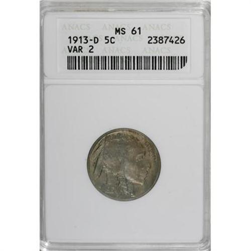 <B>1913-D 5C Type Two MS61 ANACS.</B></I> NGC Census: (26/477). PCGS Population (9/749). Mintage: 4,156,000. Numismedia Wsl. Price for NGC/PCGS coin in MS61: $225. (#3922)<BR><BR><B>Coin Engraver:</B> James E. Fraser<BR><BR><b>Shipping:</b> Coins & Currency (<a target="_blank" href="http://www.heritageauctions.com/common/shipping.php">view shipping information</a>)