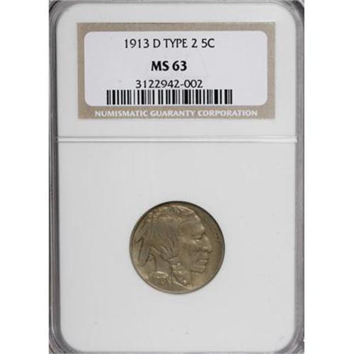 <B>1913-D 5C Type Two MS63 NGC.</B></I> NGC Census: (118/284). PCGS Population (228/469). Mintage: 4,156,000. Numismedia Wsl. Price for NGC/PCGS coin in MS63: $292. (#3922)<BR><BR><B>Coin Engraver:</B> James E. Fraser<BR><BR><b>Shipping:</b> Coins & Currency (<a target="_blank" href="http://www.heritageauctions.com/common/shipping.php">view shipping information</a>)