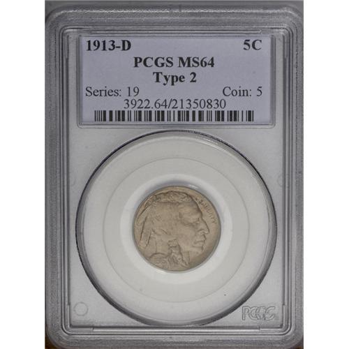 <B>1913-D<5C> Type Two MS64 PCGS.</B></I> This smooth olive-brown near-Gem has moderate striking softness on the bison's shoulder and the hair above the braid. A couple of tiny gray spots are beneath the tail and left of LIBERTY. <BR><BR><B>Important notice:</B> Heritage usually auctions material at the rate of 200-250 lots per hour. On some occasions eBay Live bid software or the Internet may not be able to keep up with the pace of the auction. We recommend placing a realistic absentee bid now as insurance to avoid disappointment. Occasionally the auctioneer may eliminate or reject an eBay Live bid, and the auctioneer may also reopen a lot after the close of the eBay live bidding (usually because we missed an audience bid), and may reject your bid even if it shows you as the winning bidder. By bidding via eBay Live, you agree that Heritage may award the lot to another bidder at its sole discretion under the circumstances described above or any other reasonable circumstances. Since eBay bids are not shown to us until we open the lot on the floor, we treat those bids just like floor bids. In most cases the floor responds before the eBay bid is presented to us, due to Internet lag time, so for consistency we have made it a policy that floor bids are always considered first over tie eBay live bids. Also please note that all Heritage lots purchased through eBay Live carry a 20% Buyer's Premium. Please make sure you read the Terms and Conditions before you bid. This lot is being auctioned in conjunction with a live floor auction by Heritage Galleries & Auctioneers. All final auction and invoice information will be supplied by Heritage Galleries & Auctioneers, and all other information should be considered preliminary. Lot:1031 <BR><BR><B>Winning Notification and Billing:</B> After the FINAL session in this auction is complete, Heritage will send e-mail and snail mail invoices. This process normally takes several days. All final auction and invoice information will be supplied by Heritage Galleries & Auctioneers, and all other information should be considered preliminary. <BR><BR>This auction will be conducted on a live auction floor and over the Internet through eBay Live. If you choose to place an absentee bid, please take a moment to <font color='#0000ff'><u><a href='http://pages.ebay.com/liveauctions/help/before/laabsentee.html'>learn how eBay Live absentee bidding works</a></u></font><font color='#000000'>