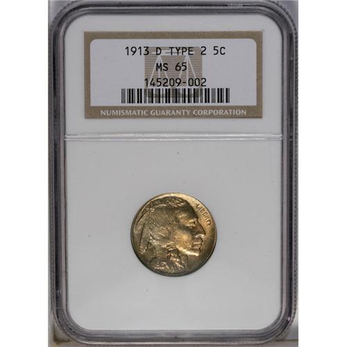 <B>1913-D<5C> Type Two MS65 NGC.</B></I> Satiny and boldly struck for the issue, this Gem is toned in subtle shades of red and gold. Desirable and scarce in high grades.