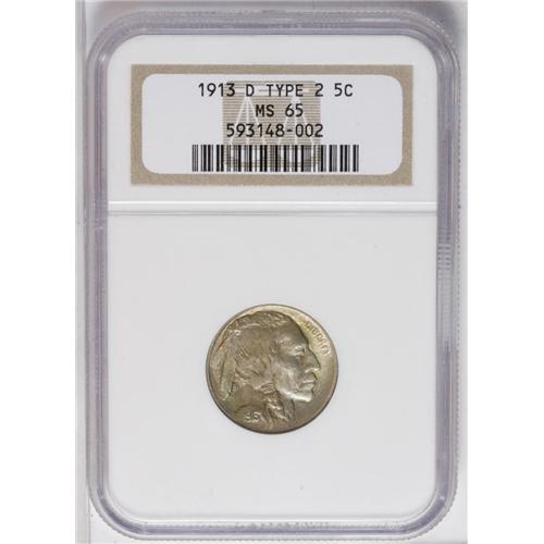 <B>1913-D<5C> Type Two MS65 NGC.</B></I> Superbly presented with iridescent green, gold, and plum color atop unscathed surfaces. The strike while not full is presentable and the bison is full horned. Only 16 examples have been deemed finer at NGC (8/06).