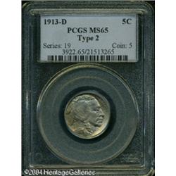 1913-D 5C Type Two MS65 PCGS. Sharply struck, and <B>1913-D 5C Type Two MS65 PCGS.</B></I> Sharply struck, and toned a light gray with some tan accents. There appear to be no significant marks. <BR><BR><B>Important notice:</B> Heritage usually auctions material at the rate of 200-250 lots per hour. On some occasions eBay Live bid software or the Internet may not be able to keep up with the pace of the auction. We recommend placing a realistic absentee bid now as insurance to avoid disappointment. Occasionally the auctioneer may eliminate or reject an eBay Live bid, and the auctioneer may also reopen a lot after the close of the eBay live bidding (usually because we missed an audience bid), and may reject your bid even if it shows you as the winning bidder. By bidding via eBay Live, you agree that Heritage may award the lot to another bidder at its sole discretion under the circumstances described above or any other reasonable circumstances. Since eBay bids are not shown to us until we open the lot on the floor, we treat those bids just like floor bids. In most cases the floor responds before the eBay bid is presented to us, due to Internet lag time, so for consistency we have made it a policy that floor bids are always considered first over tie eBay live bids. Also please note that all Heritage lots purchased through eBay Live carry a 20% Buyer's Premium. Please make sure you read the Terms and Conditions before you bid. This lot is being auctioned in conjunction with a live floor auction by Heritage Galleries & Auctioneers. All final auction and invoice information will be supplied by Heritage Galleries & Auctioneers, and all other information should be considered preliminary. Lot:5559
