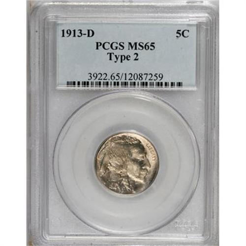 <B>1913-D 5C Type Two MS65 PCGS.</B></I> This first-year Gem is solidly struck, save for a tiny bit of weakness on the bison's forehead. The piece is highly lustrous, with an untoned obverse and a slight degree of champagne toning on the reverse. <BR><BR><B>Coin Engraver:</B> James E. Fraser<BR><BR><b>Shipping:</b> Coins & Currency (<a target="_blank" href="http://www.heritageauctions.com/common/shipping.php">view shipping information</a>)