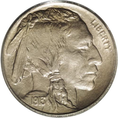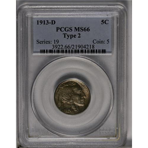 <B>1913-D<5C> Type Two MS66 PCGS.</B></I> Both sides display a delicate blend of powder-blue, lavender, and gold-tan patina that covers lustrous, well preserved surfaces, and the design elements exhibit a relatively strong strike, manifested particularly on the date, braid, and bison's tail. Minor softness is seen in the hair at the bison's brow. The digits 913 of the date are machine doubled, and a fine diagonal crack journeys from the Indian's neck through the hair to the temple. Population: 44 in 66, 8 finer (6/06).