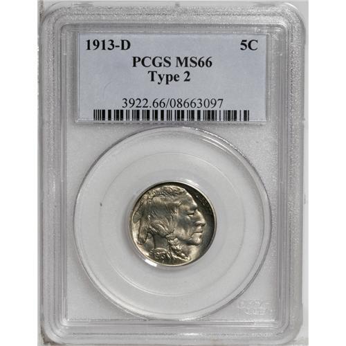 <B>1913-D<5C> Type Two MS66 PCGS.</B></I> Delicate honey and steel-blue patina endows this thoroughly lustrous and exquisitely preserved Premium Gem. The strike is crisp, especially on the bison's tail. The Type One pieces were set aside as examples of the attractive new design. When the Type Two issues were released later in the year, the novelty had faded, and most pieces remained in circulation until well-worn. Population: 44 in 66, 8 finer (8/06).