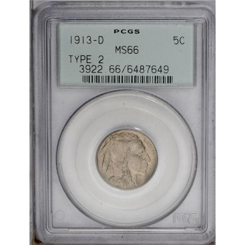 <B>1913-D<5C> Type Two MS66 PCGS.</B></I> Housed in an older green-label holder is a lovely Premium Gem example with frosty surfaces, brilliant luster, and light gold toning. Both sides are well struck with just the slightest weakness at the center of the reverse, toward the top of the bison's front leg. Population: 44 in 66, 7 finer (4/06).