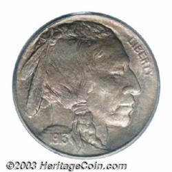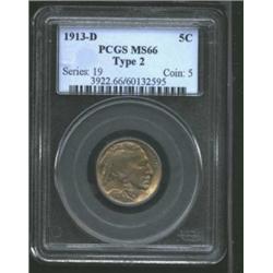 <TABLE cellSpacing=0 cellPadding=0 width="100%" bgColor=#000000 border=0><TBODY><TR><TD width="100%"><TABLE cellSpacing=1 cellPadding=3 width="100%" border=0><TBODY><TR><TD width="100%" bgColor=#79735c><FONT face=arial color=#ffffff size=3><B>Description</B> </FONT></TD></TR><TR><TD width="100%" bgColor=#ffffff><FONT face=arial size=2><B>1913-D 5C Type Two MS66 PCGS.</B></I> Splashes of apricot and olive-gray patina rest atop intricately detailed surfaces. An outstanding representative of this first year key. Population: 39 in 66, 5 finer (8/03). </FONT></TD></TR></TBODY></TABLE></TD></TR></TBODY></TABLE><BR><A name=PricesRealized></A><TABLE cellSpacing=0 cellPadding=0 width="100%" bgColor=#000000 border=0><TBODY><TR><TD width="100%"><TABLE cellSpacing=1 cellPadding=3 width="100%" border=0><TBODY><TR><TD width="100%" bgColor=#79735c><A name=PR><FONT face=arial color=#ffffff size=3><B>Previous Prices from Heritage Auctions</B> </FONT></A></TD></TR><TR><TD bgColor=#f6f6ed><TABLE cellSpacing=0 cellPadding=0 width="100%" border=1><TBODY><TR><TD align=middle width="33%"><B>Date</B></TD><TD align=middle width="33%"><B>Service</B></TD><TD align=middle width="33%"><B>Price</B></TD></TR><TR bgColor=whitesmoke><TD width="33%"><B>07/29/2003</B></TD><TD width="33%">PCGS</TD><TD width="33%">$2,875.00</TD></TR><TR bgColor=whitesmoke><TD width="33%"><B>09/28/2002</B></TD><TD width="33%">PCGS</TD><TD width="33%">$4,600.00</TD></TR><TR bgColor=whitesmoke><TD width="33%"><B>08/17/1996</B></TD><TD width="33%">PCGS</TD><TD width="33%">$1,980.00</TD></TR><TR bgColor=whitesmoke><TD width="33%"><B>03/01/2000</B></TD><TD width="33%">NGC</TD><TD width="33%">$1,725.00</TD></TR></TBODY></TABLE></TD></TR><TR><TD bgColor=#ffffff><FONT face=arial size=1 ?>PLEASE NOTE: All prices realized reflect the final hammer price PLUS the buyer's premium in auctions that charge a buyer's premium. Each item has a notation at the top of the listing indicating whether that lot included a buyer's premium. Example: A item that sells with a final hammer price of $100 and a 20% buyer's premium will display with a price realized of $120. All information listed is intended to be as accurate as possible, but errors are possible. Please use this guide carefully and inform us of any inaccuracies. </FONT></TD></TR></TBODY></TABLE></TD></TR></TBODY></TABLE><BR><TABLE cellSpacing=0 cellPadding=0 width="100%" bgColor=#000000 border=0><TBODY><TR><TD width="100%"><TABLE cellSpacing=1 cellPadding=3 width="100%" border=0><TBODY><TR><TD width="100%" bgColor=#79735c colSpan=6><FONT face=arial color=#ffffff size=3><B>Price Guide*</B> </FONT></TD></TR><TR bgColor=#f6f6ed><TD align=middle><B>Grade</B> </TD><TD align=middle><B>Coin World<BR>(Trends)</B> </TD><TD align=middle><B>Numismedia<BR>Retail</B> </TD><TD align=middle><B>Numismedia<BR>Wholesale</B> </TD><TD align=middle><B>Coin<BR>Universe</B> </TD><TD align=middle><B>Heritage<BR>Value Index</B> </TD></TR><TR bgColor=#ffffff><TD align=middle>65</TD><TD align=right>$1,250.00</TD><TD align=right>---</TD><TD align=right>$950.00</TD><TD align=right>$1,485.00</TD><TD align=right>$927.38</TD></TR><TR style="FONT-WEIGHT: bold" bgColor=#cccfdd><TD align=middle>66</TD><TD align=right>$4,250.00</TD><TD align=right>---</TD><TD align=right>$2,575.00</TD><TD align=right>$4,250.00</TD><TD align=right>$3,050.00</TD></TR><TR bgColor=#ffffff><TD align=middle>67</TD><TD align=right>---</TD><TD align=right>---</TD><TD align=right>$12,500.00</TD><TD align=right>$20,000.00</TD><TD align=right>$14,000.00</TD></TR><TR bgColor=#ffffff><TD colSpan=6><FONT size=1>*All information listed is intended to be as accurate as possible, but errors are possible. No item may be returned or refused based on this information which is provided as a service to our customers. You should contact each pricing source directly to determine the accuracy of this information. </FONT></TD></TR></TBODY></TABLE></TD></TR></TBODY></TABLE><BR><TABLE cellSpacing=0 cellPadding=0 width="100%" bgColor=#000000 border=0><TBODY><TR><TD width="100%"><TABLE cellSpacing=1 cellPadding=3 width="100%" border=0><TBODY><TR><TD width="100%" bgColor=#79735c><FONT face=arial color=#ffffff size=3><B>Population Guide</B> </FONT></TD></TR><TR bgColor=#ffffff><TD align=middle><!-- Begin Output of Population Grid--><TABLE cellSpacing=0 cellPadding=0 width="100%" border=0><TBODY><TR><TD vAlign=center><TABLE cellSpacing=0 width="100%" border=1 cellsadding="3"><TBODY><TR><TD vAlign=center><TABLE cellSpacing=0 cellPadding=3 width="100%" border=1><TBODY><TR><TD vAlign=center align=middle bgColor=#f0f1e8 colSpan=2 <CENTER><FONT face=Arial size=2><B>PCGS Pop </B></FONT><CENTER></CENTER></TD><TD vAlign=center align=middle bgColor=#f0f1e8 colSpan=2><CENTER><FONT face=Arial size=2><B>NGC Pop</B></CENTER></FONT></TD></TR><TR><TD vAlign=center><FONT face=Arial size=2>(66)</FONT> </TD><TD vAlign=center align=right><FONT face=Arial size=2>39</FONT> </TD><TD vAlign=center><FONT face=Arial size=2>(66)</FONT> </TD><TD vAlign=center align=right><FONT face=Arial size=2>9</FONT> </TD></TR><TR><TD vAlign=center><FONT face=Arial size=2>(>66)</FONT> </TD><TD vAlign=center align=right><FONT face=Arial size=2>5</FONT> </TD><TD vAlign=center><FONT face=Arial size=2>(>66)</FONT> </TD><TD vAlign=center align=right><FONT face=Arial size=2>1</FONT> </TD></TR></TBODY></TABLE></TD></TR></TBODY></TABLE></TD></TR></TBODY></TABLE><!-- End Output of Population Grid--> Important notice: Heritage usually auctions material at the rate of 200-250 lots per hour. On some occasions eBay Live bid software or the Internet may not be able to keep up with the pace of the auction. We recommend placing a realistic absentee bid now as insurance to avoid disappointment. Occasionally the auctioneer may eliminate or reject an eBay Live bid, and the auctioneer may also reopen a lot after the close of the eBay live bidding (usually because we missed an audience bid), and may reject your bid even if it shows you as the winning 