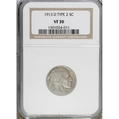 <B>1913-D 5C Type Two VF30 NGC.</B></I> NGC Census: (4/645). PCGS Population (9/962). Mintage: 4,156,000. Numismedia Wsl. Price for NGC/PCGS coin in VF30: $152. (#3922)<BR><BR><B>Coin Engraver:</B> James E. Fraser<BR><BR><b>Shipping:</b> Coins & Currency (<a target="_blank" href="http://www.heritageauctions.com/common/shipping.php">view shipping information</a>)