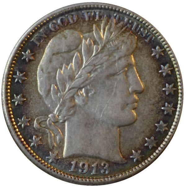 1913-D Barber Half Dollar. Extremely Fine. Light scratch at cheek.