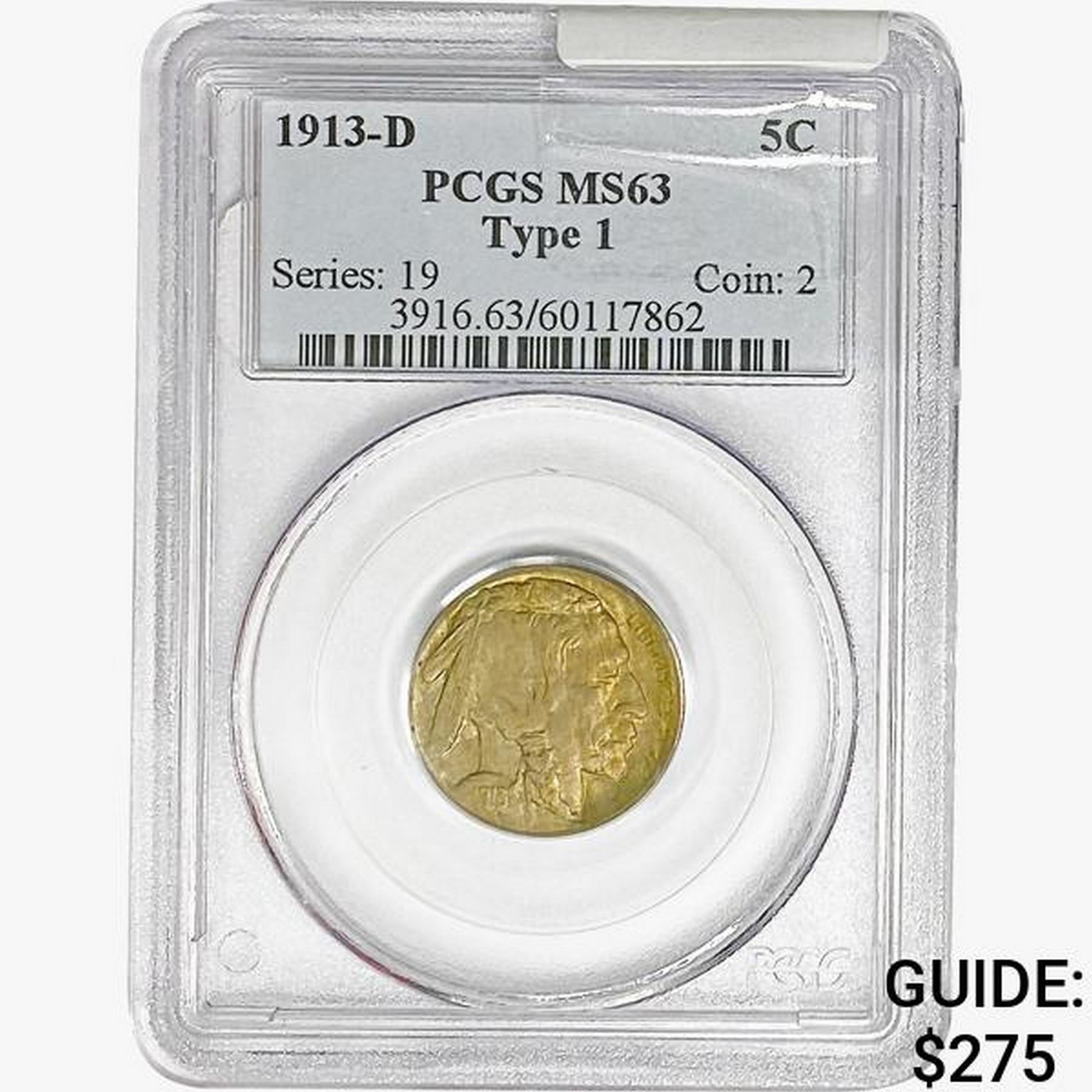 1913-D Buffalo Nickel PCGS MS53 Ty 1