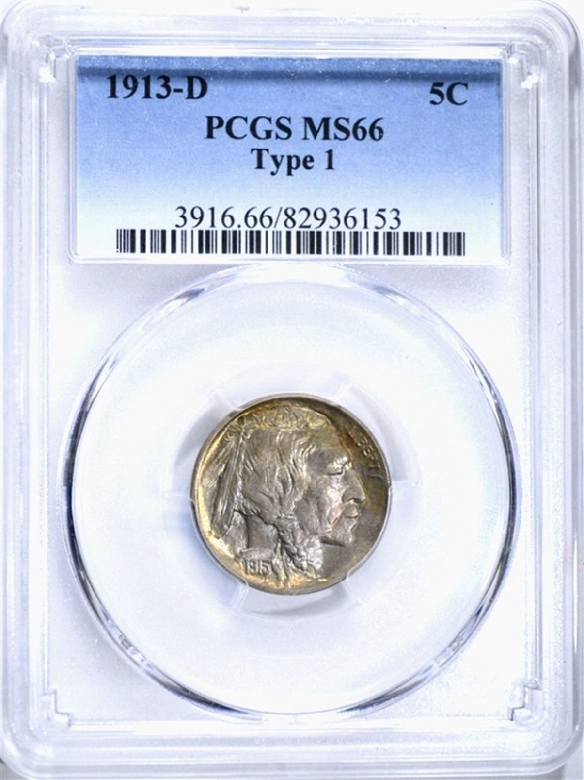 1913-D T-1 BUFFALO NICKEL, PCGS MS-66 SUPER