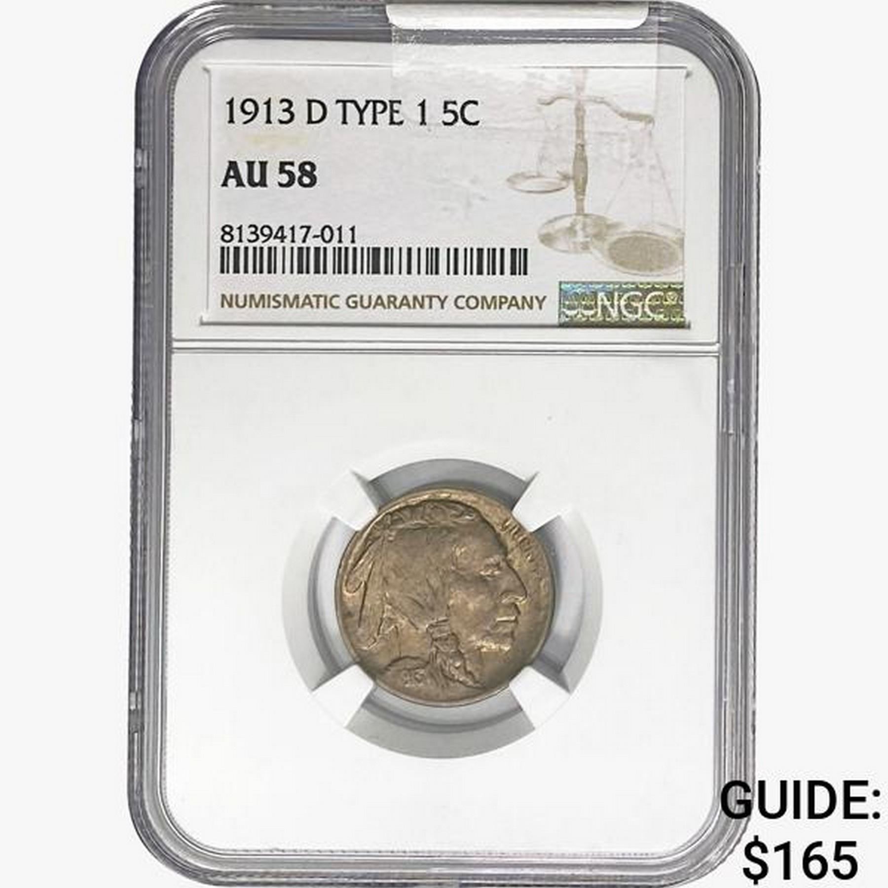 1913-D TYPE 1 Buffalo Nickel NGC AU58