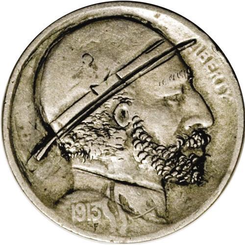 <B>1913-D (Type Two):</B></I> An Above Average original piece, the unknown artist has created a plain crown on the hat with a narrow hatband and a small bow. The most noticeable feature on this coin is the very small ear. Curly beard, hair, etc., and a faint eyebrow on the subject. Plain, straight-line collar with a portion of the original Indian's braid ties still in evidence below. Carved on a Very Fine host coin.<BR><BR><b>Shipping:</b> Coin/Currency (<a target="_blank" href="http://www.heritageauctions.com/common/shipping.php">view shipping information</a>)