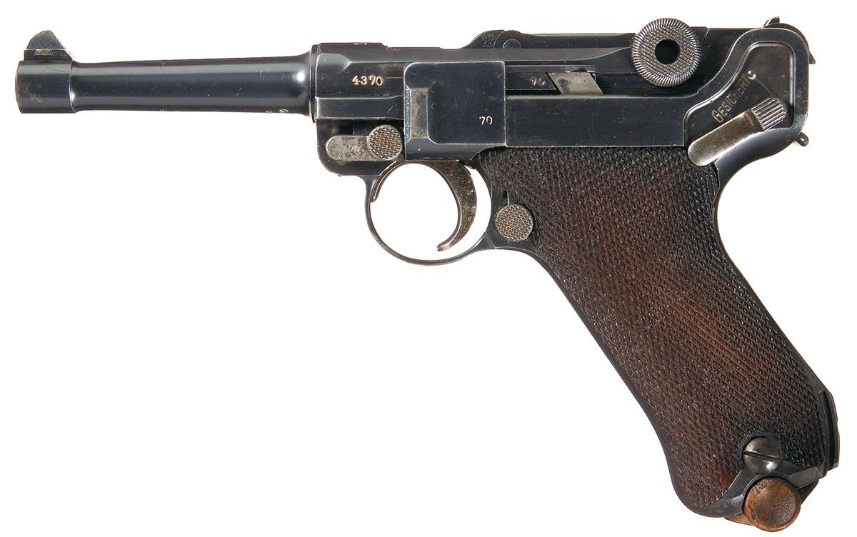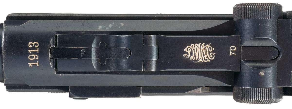 This is an example of a 1908 Military Contract, German Luger pistol as used by the imperial German forces prior to and during WWI. The top of the chamber area is dated 1913 and the right side of the barrel extension is marked with three "crown/script letter" proofs and one Imperial eagle proof. The top right side of the barrel has a single Imperial Eagle proof along with "Bo.25" over the serial number and bore diameter underneath. The toggle link is marked "DWM" and the left side of the toggle has a small Imperial eagle proof. It is marked "GELADEN" and "GESICHERT" on the extractor and safety area respectively and it has checkered walnut grips with a rust blue metal finish, and straw color on the takedown lever, trigger, magazine release, ejector and safety lever. The magazine is the standard WWI nickel plated body with the wood base that is marked on the bottom with the number "1" and the backstrap is cut for a stock. Matching serial numbers on the barrel extension, frame and barrel, with the partial serial number "70" on most small parts.