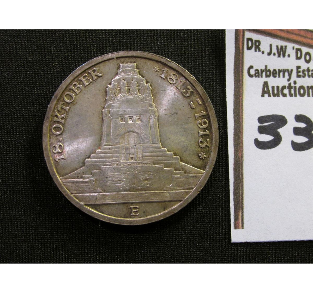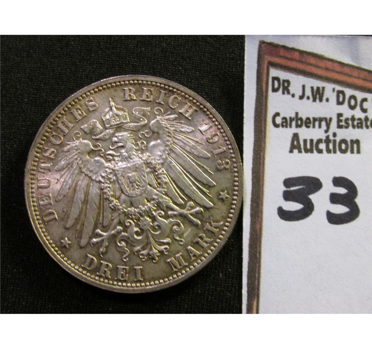 1913 E Saxony, Germany Three Mark Silver. Toned AU-BU. KM1275.