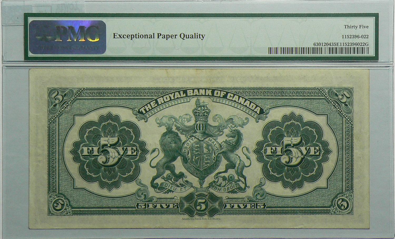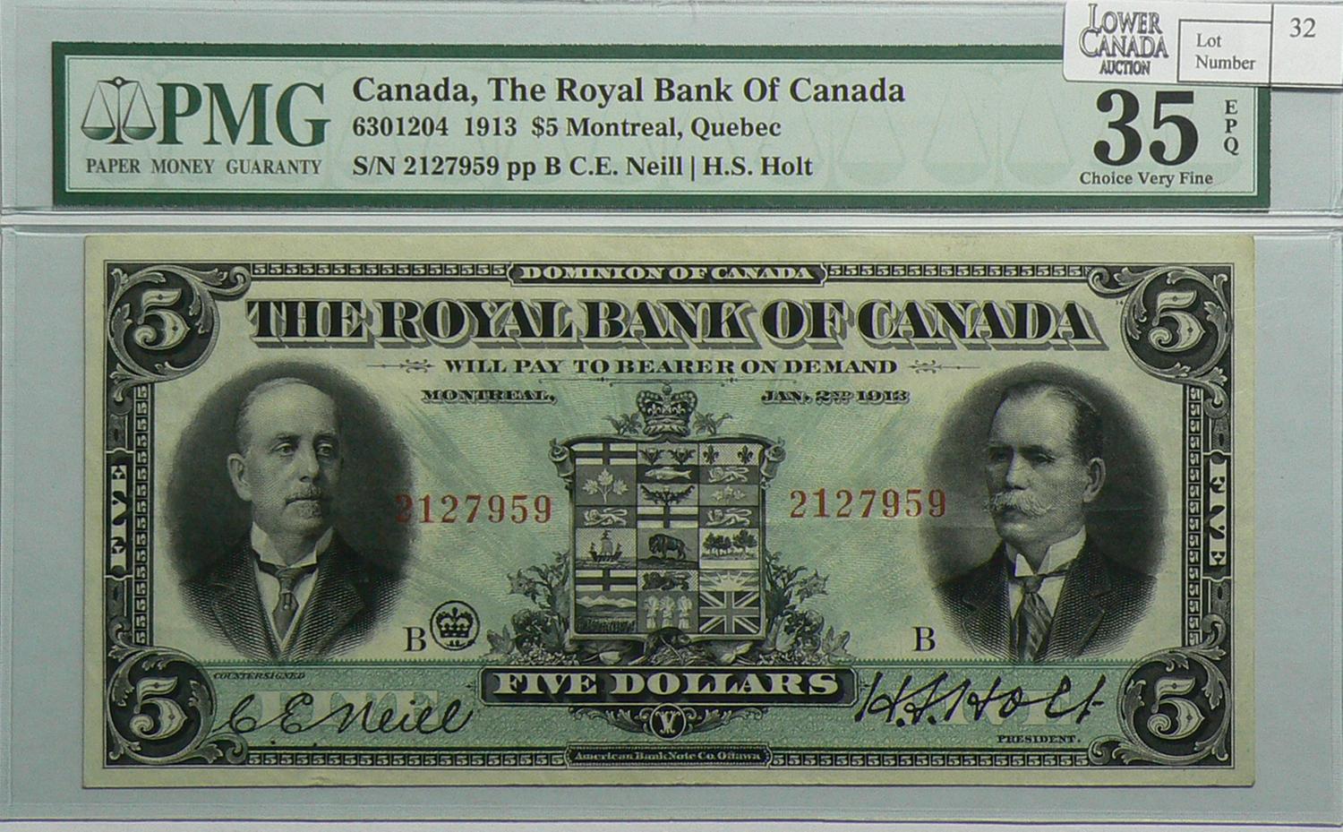 1913 Five Dollars Royal Bank of Canada, 630-12-04, PMG VF-35, Neil Holt, Letter B, serial 2127959.