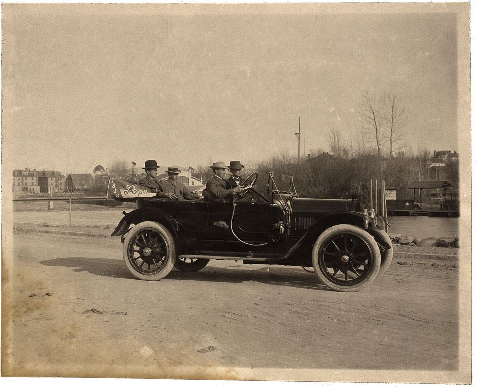 An 8 x 10” black and white real photo matted to 11 x 12 ½” size on gray matting board, showing a beautiful old convertible car with four men dressed in suits and wearing hats. The folded convertible top has a banner reading “Pope 1913.” The car is headed down a dirt street beside a river. Brick institutional buildings can be seen in the background and a few houses perched on the hillside across the river can be seen amidst bare-limbed trees. There is staining in the lower left corner of the photo and the matting has some foxing along its edges. No photographer identified.