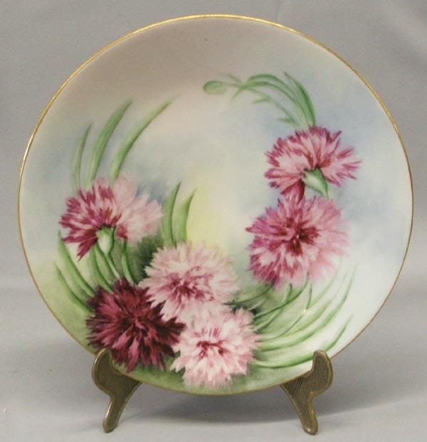 1913 French Hand Painted Plate by Grace Hachenberg. Back of plate is stamped, ''B&Co France'' and is signed ''Grace Hachenberg. 1913.'' Measures 9.5'' diameter. The brass plate stand is 7''x4''. SHI $20.