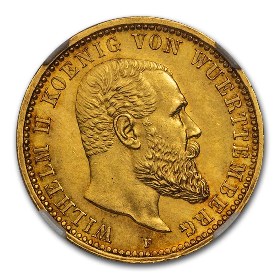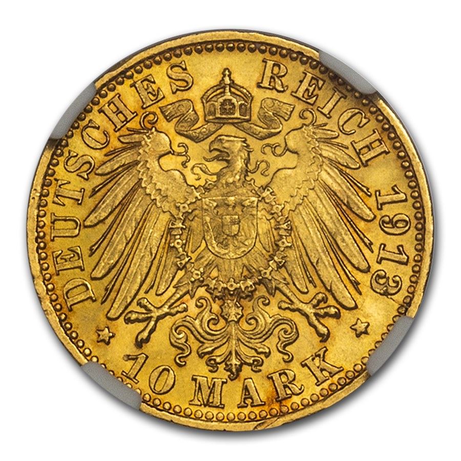 1913 German States Wurttemberg Gold 10 Mark MS-64+ NGC