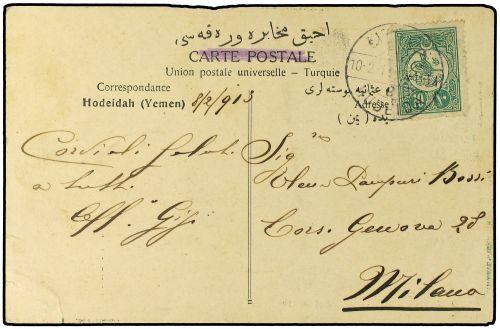 1913 HODEIDA a MILAN. Tarjeta Postal con sello de Turquia de 10 pa mat. HODEIDA.