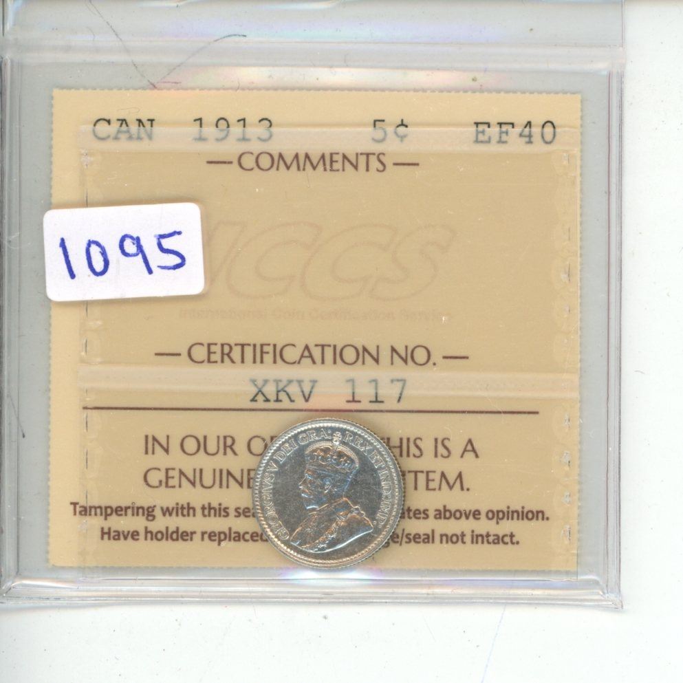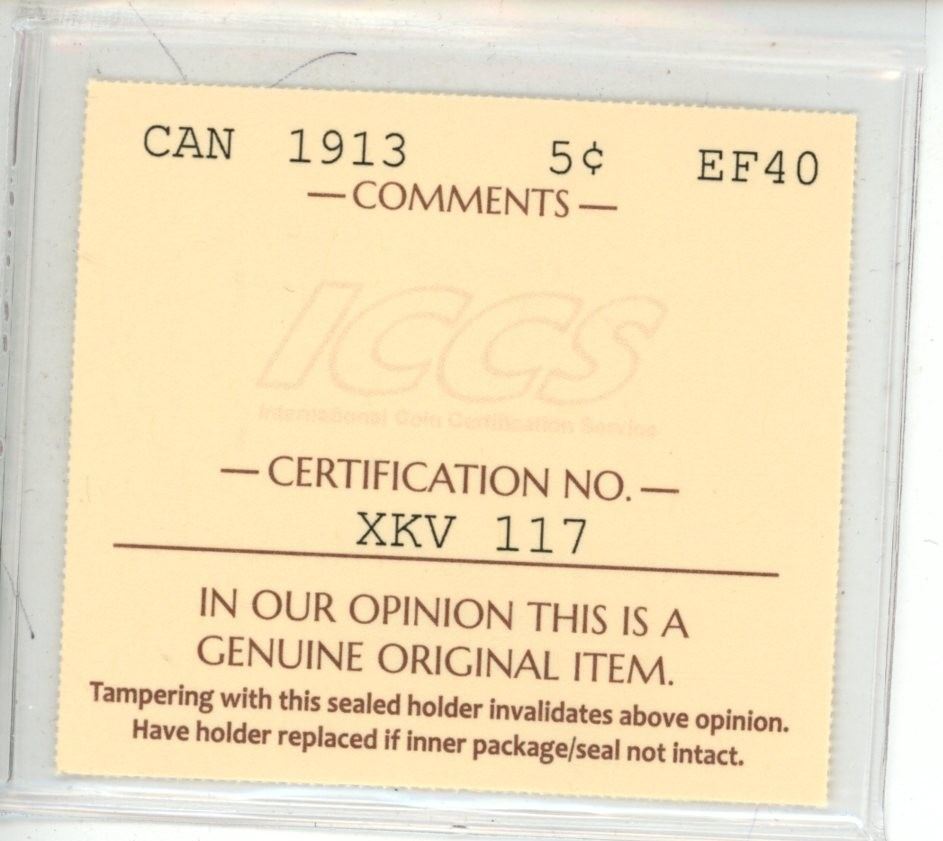 1913 ICCS Graded - Canadian Five Cent - EF40