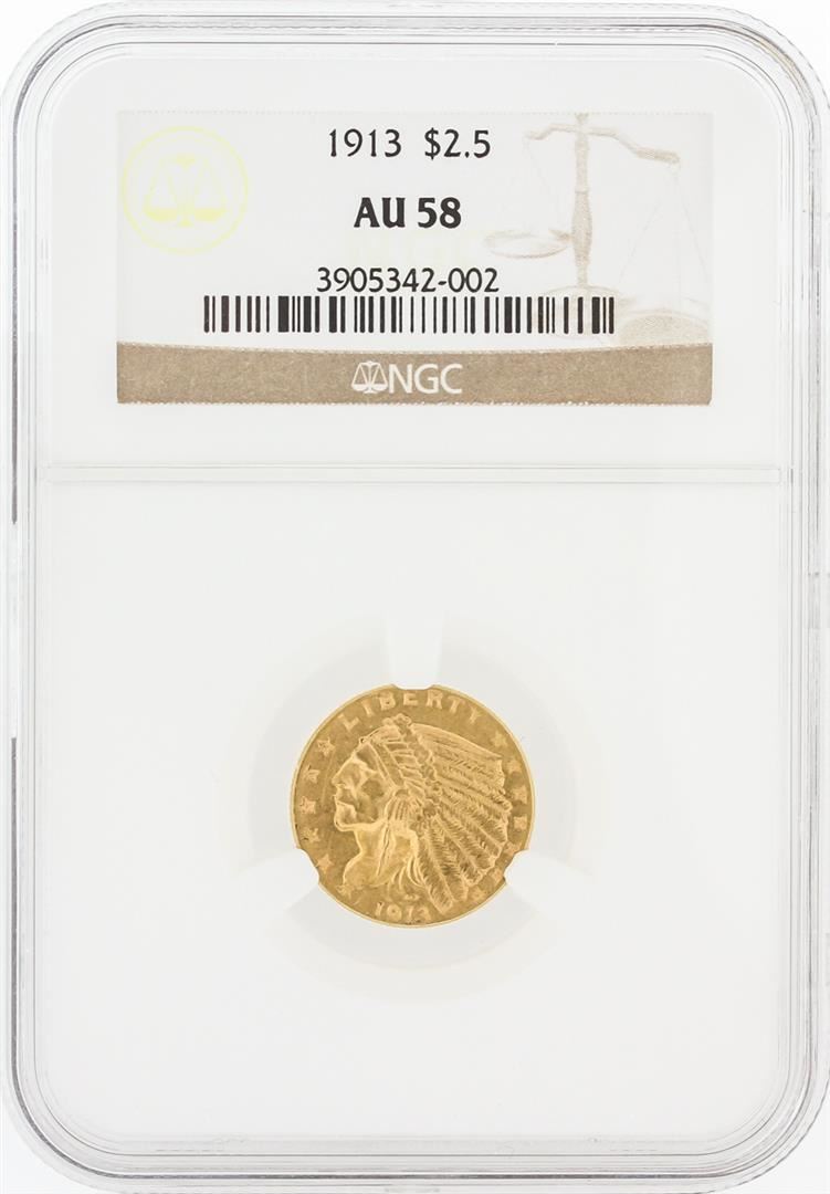 One 1913 NGC AU58 $2.50 Indian Head Quarter Eagle Gold Coin. NGC Certified.