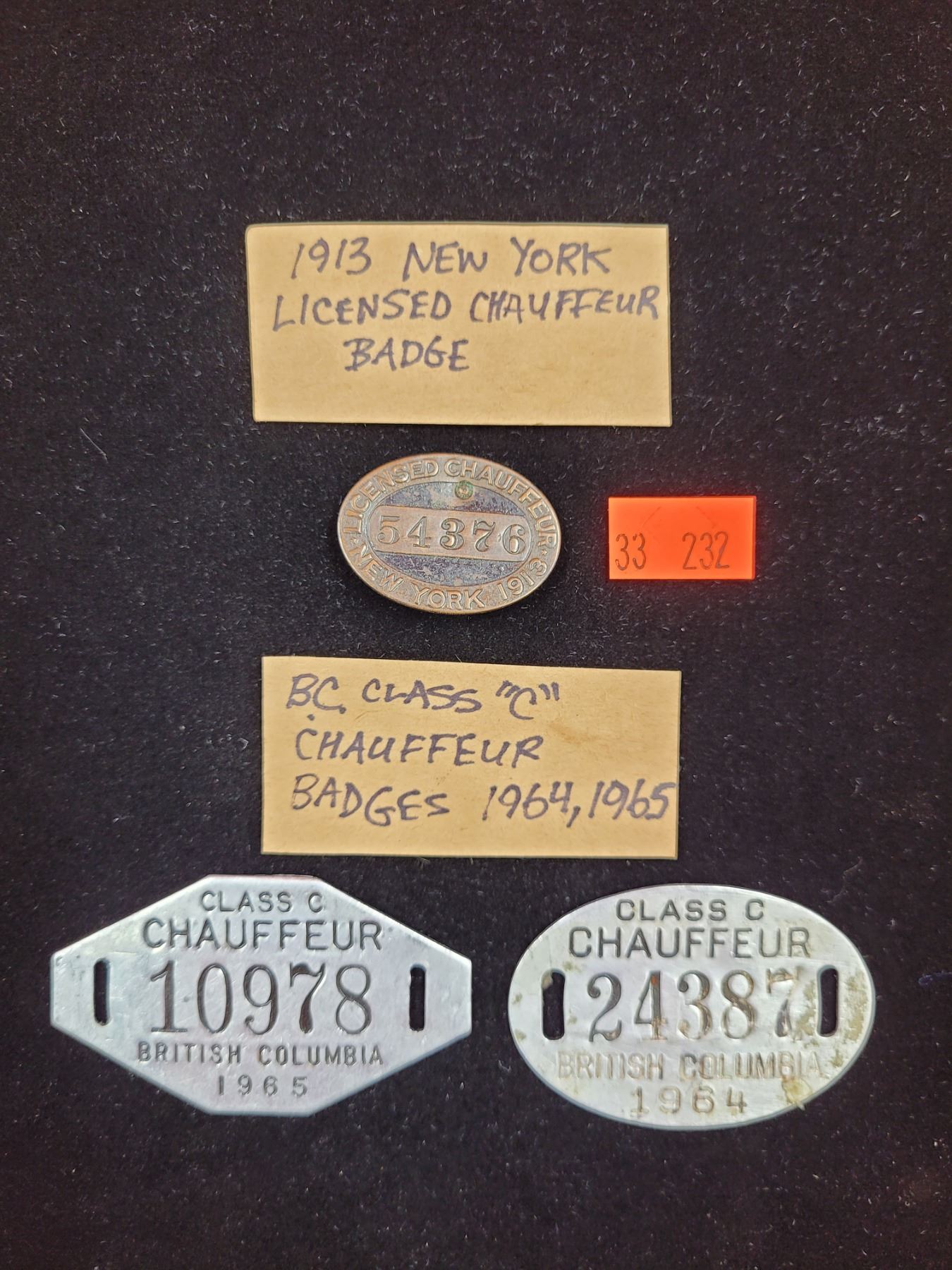 1913 New York Licensed Chauffeur Badge & BC Class "C" Chauffeur Badges 1964,65